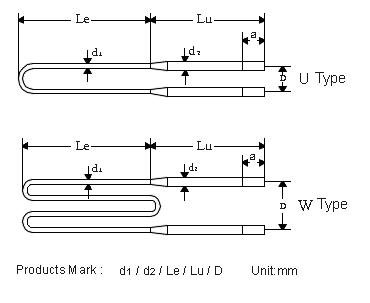 "¸·´ë(Pole, Bar)" ŸÀÔ, "U" ŸÀÔ, "W" ŸÀÔ, "U"-Á÷°¢(right angle), µî ´Ù¾çÇÑ ÇüŸ¦ »ý»êÇÒ ¼ö ÀÖ´Ù. MoSi2 È÷ÅÍ